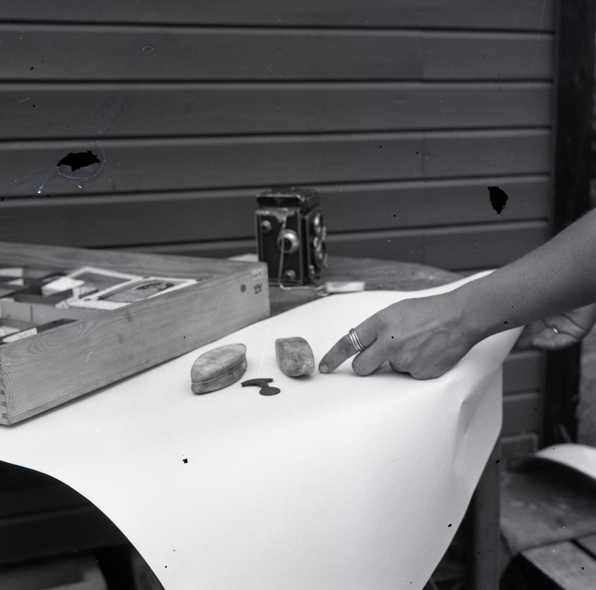 Fynd från Skedemosse, 20/7 1962, bland annat en slipsten.