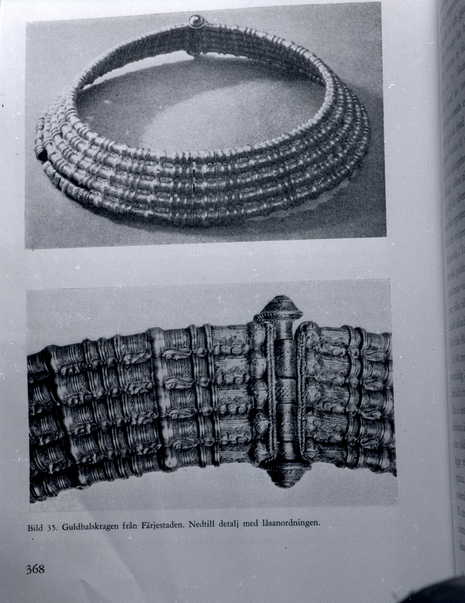 Fornfynd av ett praktfullt halssmycke av guld, bestående av fem på varandra lagda rör prydligt ornerade och med fina drakfigurer med flera sirater insatta i rörens mellanrum och försedda med gångled för att kunna öppnad. Vikt 707 gram.