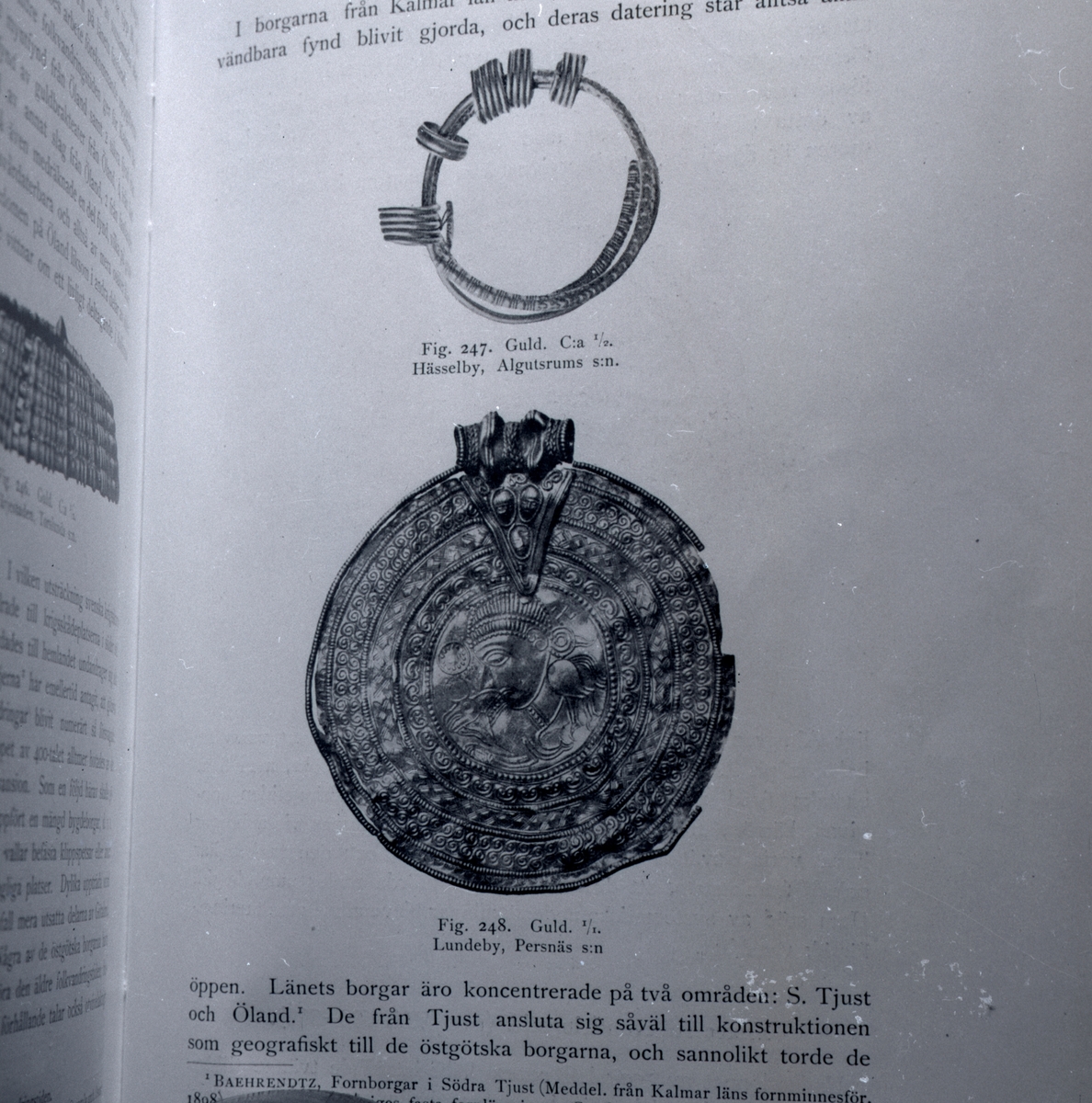 Guldbrakteat, två tum i diameter, i mitten ett människohuvud med diadem över ett behornat, fyrbent djur. I övre kanten en enkel ögla, runt kring kanten en omvikt räfflad rand. Hittad av bonden Nils Danielsson, Lundeby nr 2, Persnäs socken på dennes ägor. Inlöst med 26 riksdaler, 10 skilling banco år 1856.