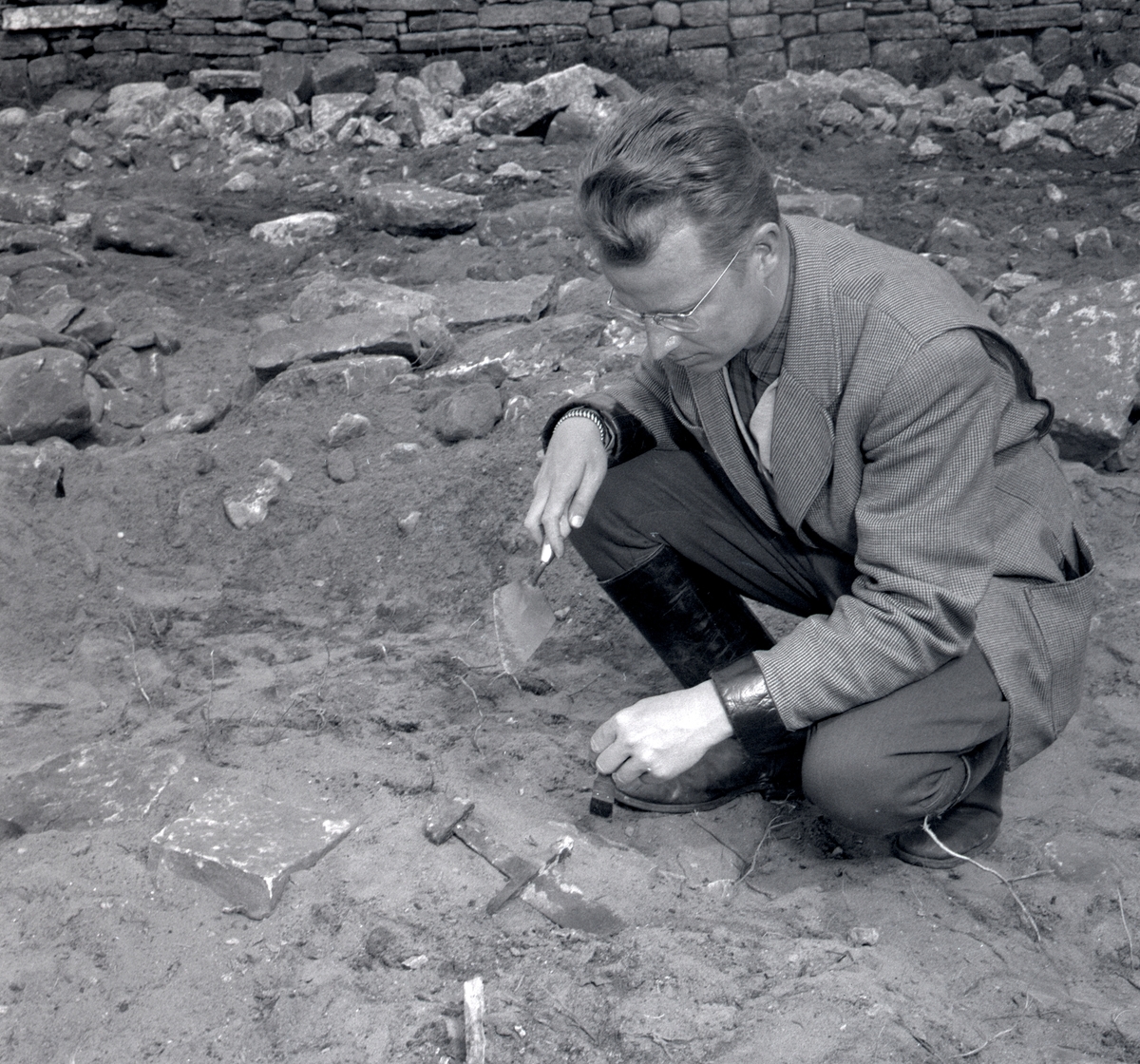 K-G Petersson utför en arkeologisk undersökning vid Klinta 1957. Här har man funnit ett svärd.