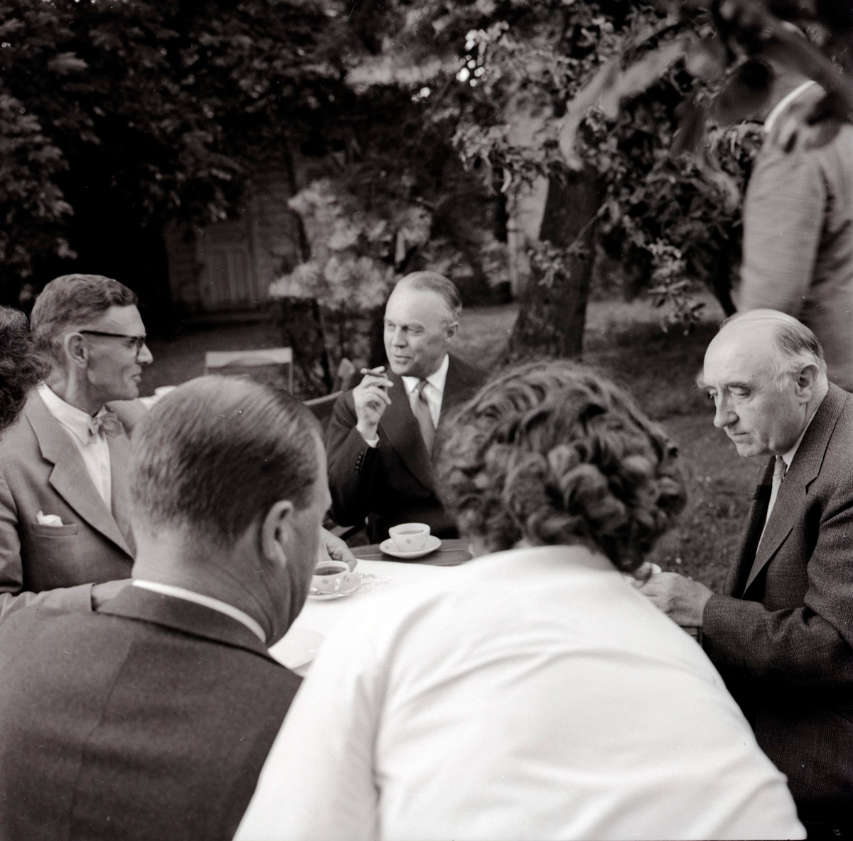 Turistintendent Bertil Sjöberg med flera träffas i samband med M/S Nordpol premiärresa till Gotland, 1959.
