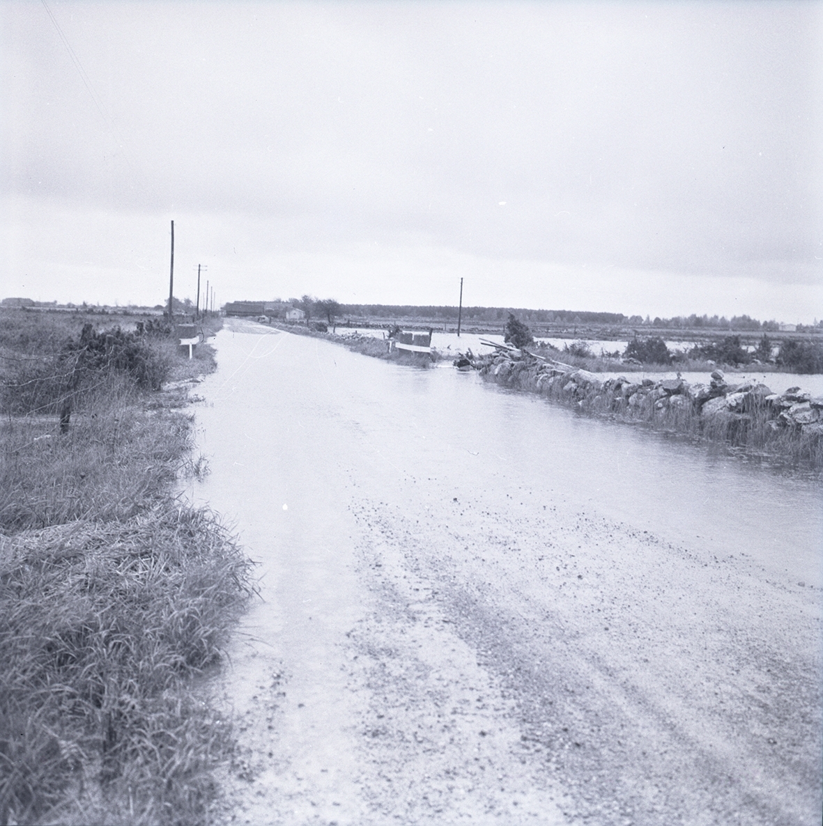 Skördeskadereportage. Vattenfylld väg och åker.