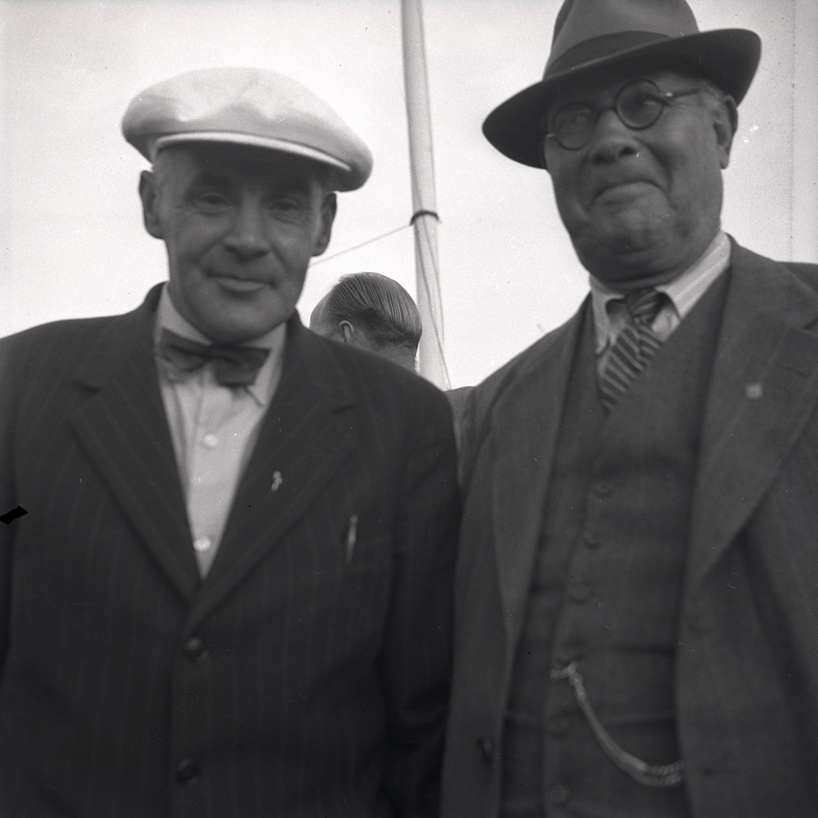 Två män som är vid en folksamling när Ernst Wigforss var i Färjestaden. Finansminister 1932-1949 under Per Albin Hansson och Tage Elanders tid.
