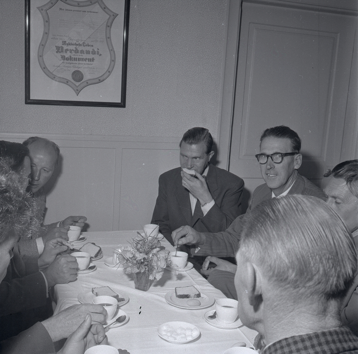 Personer på en socialdemokratisk distriktskongress som sitter och dricker kaffe, sept -57. Angående tjänstepension ATP.