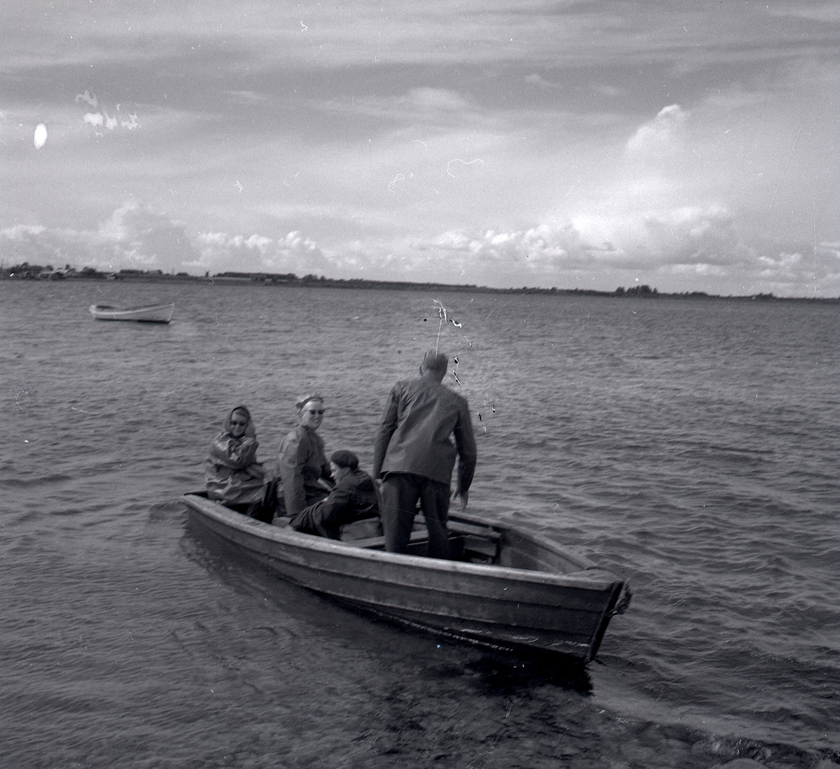 Ulf Erik Hagberg, Ragnhild Boström och ev. Gunnel Forsberg Warringer samt okänd man i en eka på väg in till Kårehamn.