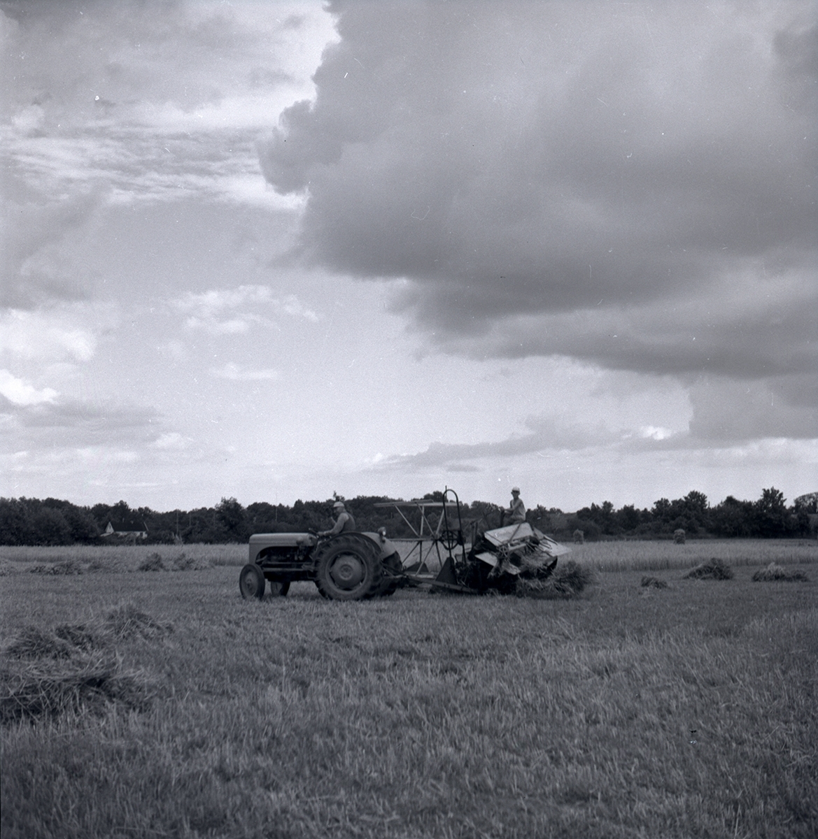 Rågskörd med självbindare. Här ses hur nekarna släpps ut från självbindaren.