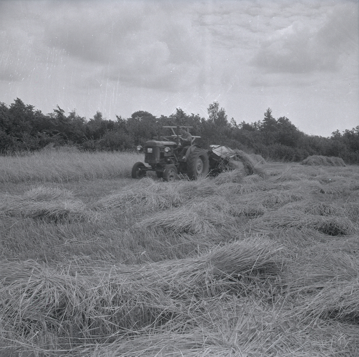 Rågskörd med självbindare. Nekarna har fallit av självbindaren och väntar på att samlas upp.