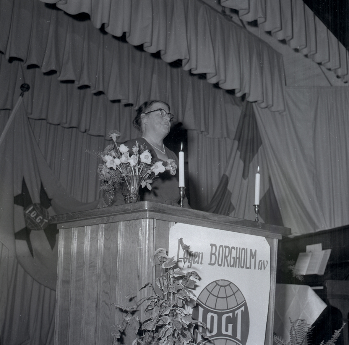Invigning av lokalen. Kvinna som håller tal. IOGT-logen 75 år den 16/11 -57.