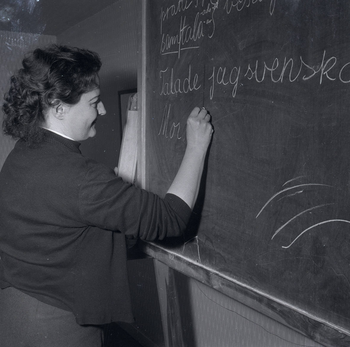 Bild tagen i samband med att flyktingar ifrån Ungern anlände 1956. Kvinna som skriver på en tavla i Godtemplargården. Hösten 56 - våren 57.