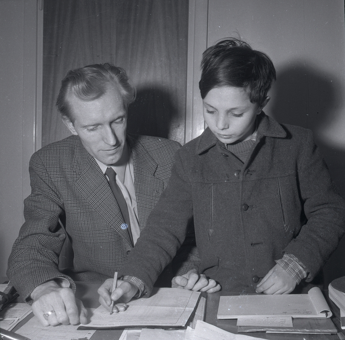 Registrering av Ungerska flyktingar. Skriver på blankett i Godtemplargården. Hösten 56 - våren 57.