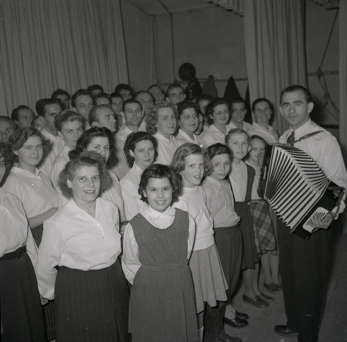 Bild tagen i samband med att flyktingar ifrån Ungern kom 1956. En man som håller i ett dragspel vid en folksamling i Godtemplargården hösten 56 - våren 57.