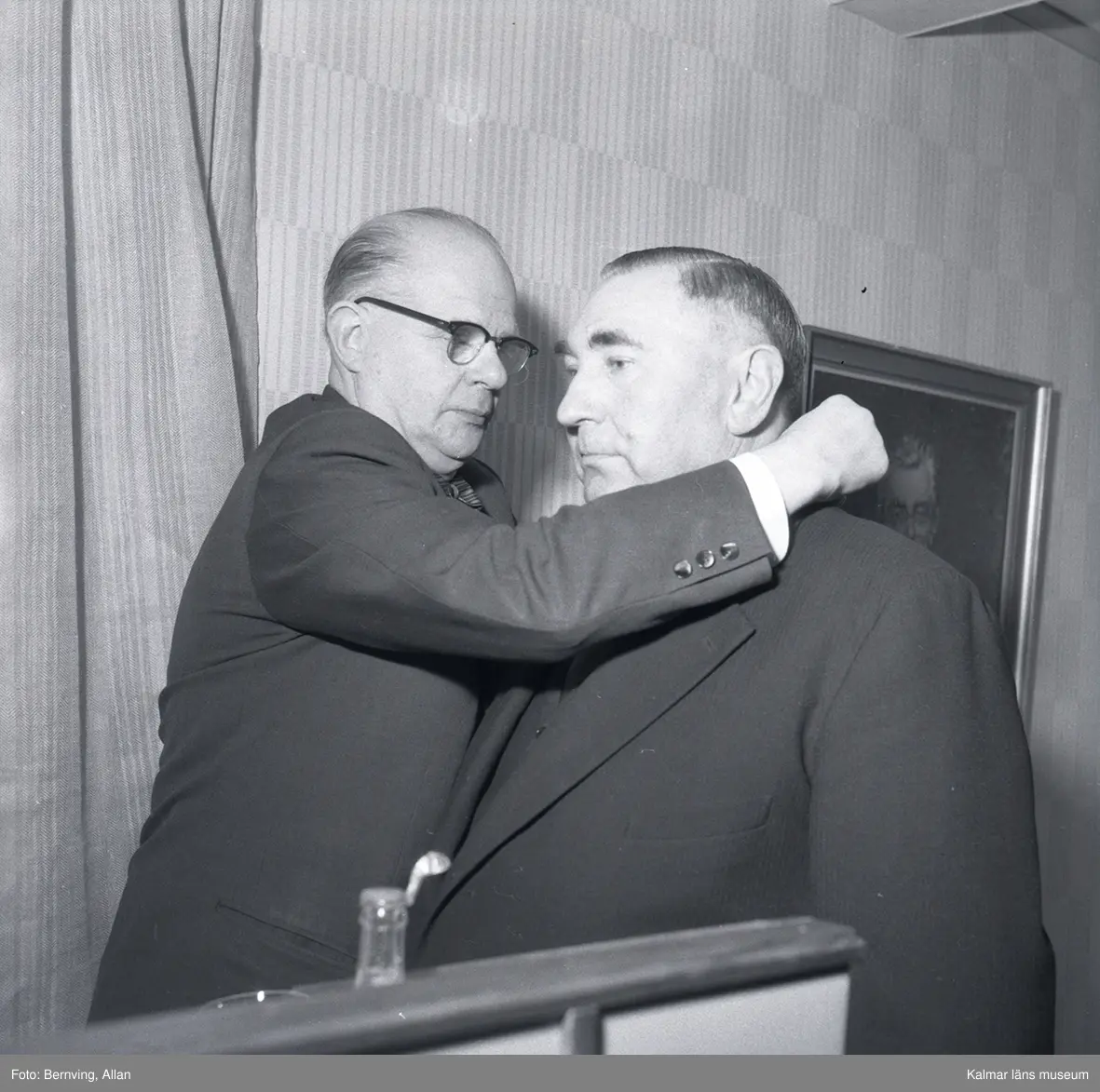 Gärdslösa kommungård (förut ålderdomshem) i biblioteket. Ruben Wagnsson till vänster. Troligen en kram vid invigning.