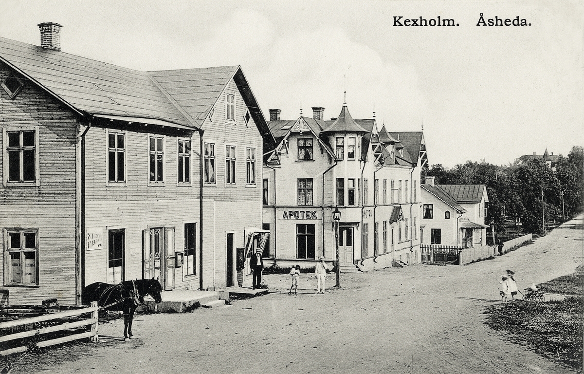 Åseda. Vy över Kexholm med speceriaffär, apotek m.m. Tidigt 1900-tal.