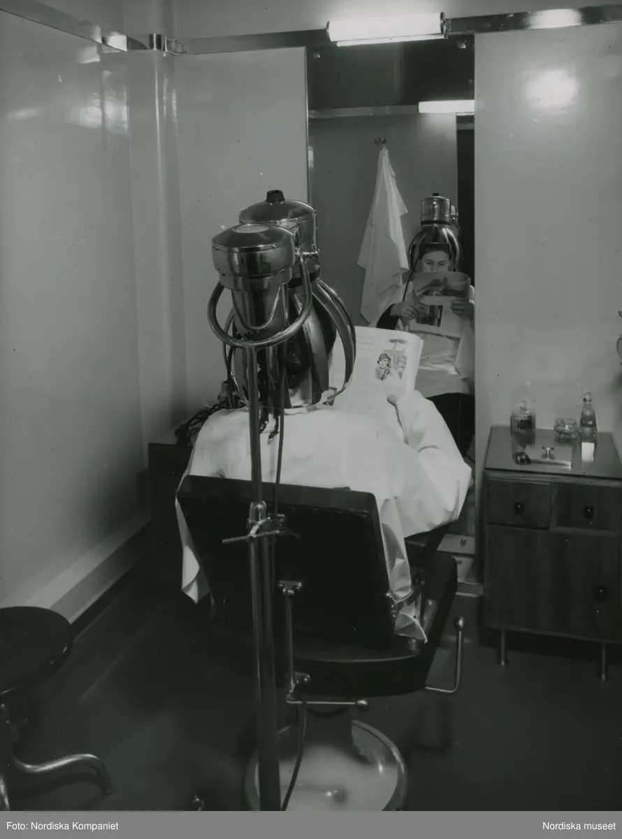 kvinna med huvudet under en torkhuv. Nordiska Kompaniet. Text med blyerts på baksidan: "Hygieniska avd. Jan. 1935 torkhuv".