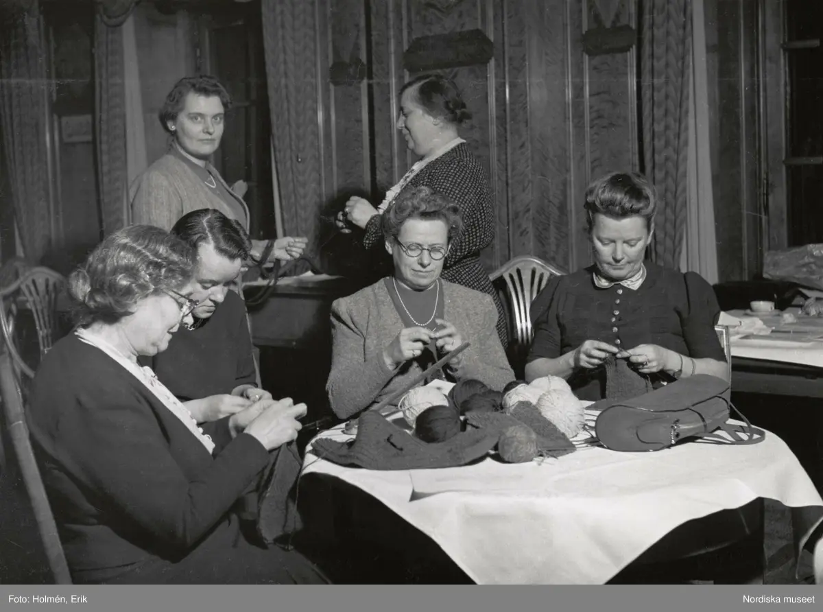 Beredskapsstickning på Nordiska kompaniet. Fyra kvinnor sitter runt bord och stickar, två kvinnor står bakom.