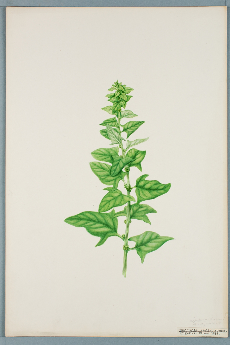 Sveriges kulturväxter. Illustration utförd av Henriette Sjöberg. Spenat, rundbladig, vanlig. Odlad Ultuna 1875. Inv. nr. C101 : 411.