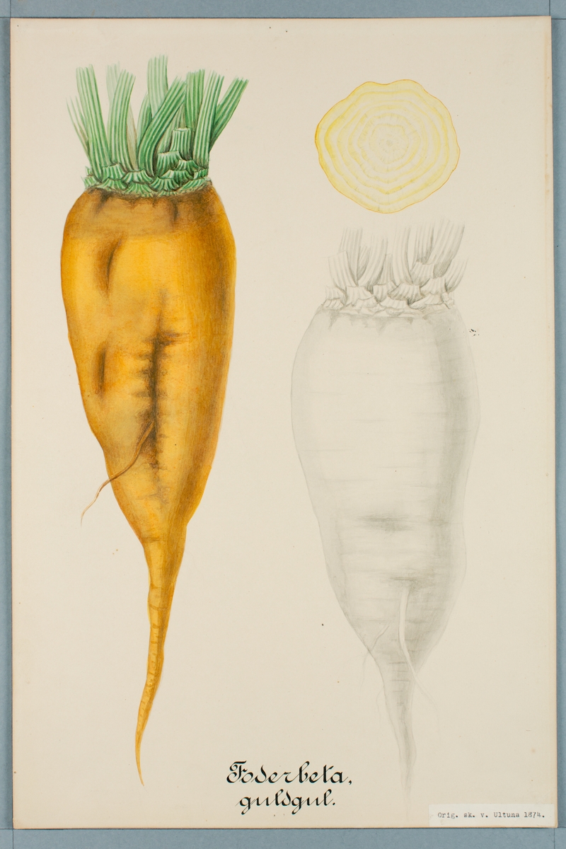 Sveriges kulturväxter. Illustration utförd av Henriette Sjöberg. Foderbeta, lång, guldgul. Odlad Ultuna 1874. Inv. nr. C101 : 248.