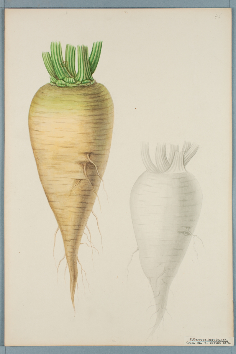 Sveriges kulturväxter. Illustration utförd av Henriette Sjöberg. Foderrova, lång, gul, Bortfelder. Odlad Ultuna 1874. Inv. nr. C101 : 257.