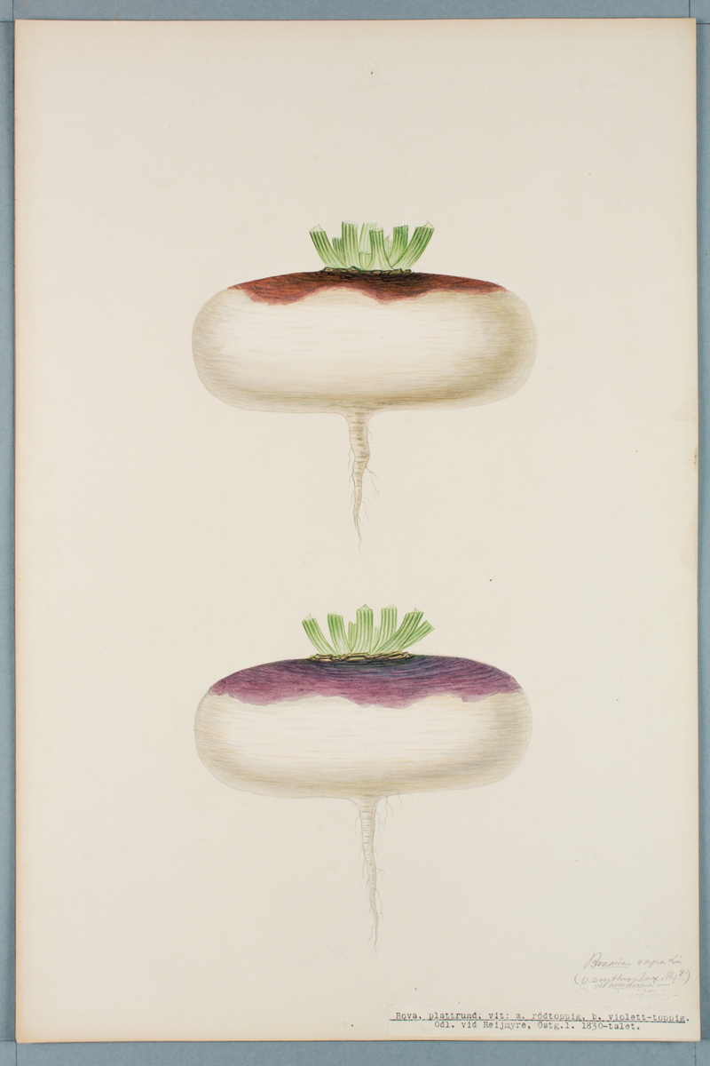 Sveriges kulturväxter. Illustration utförd av Henriette Sjöberg. Rova, plattrund, vit, a: rödtoppig b: violett-toppig. Odlad Reijmyre, Östergötland 1830-talet. Inv. nr. C101 : 271.