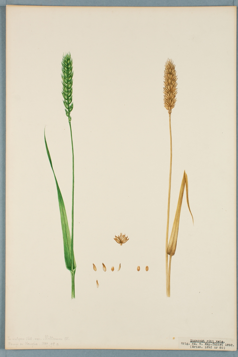Sveriges kulturväxter. Illustration utförd av Henriette Sjöberg. Ungerskt rött vete. Odlat Experimentalfältet 1892. Inv. nr. C101 : 107. Signerad H.S. 1889.