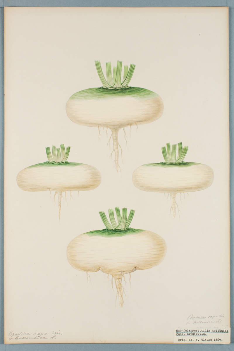 Sveriges kulturväxter. Illustration utförd av Henriette Sjöberg. Maj-foderrova, rund, gröntoppig, tidig holländsk. Odlad Ultuna 1869. Inv. nr. C101 : 269.