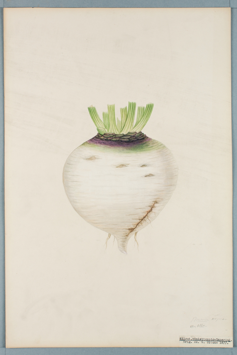 Sveriges kulturväxter. Illustration utförd av Henriette Sjöberg. Kålrot, violett-toppig, Imperial. Odlad Ultuna 1877. Inv. nr. C101 : 292.