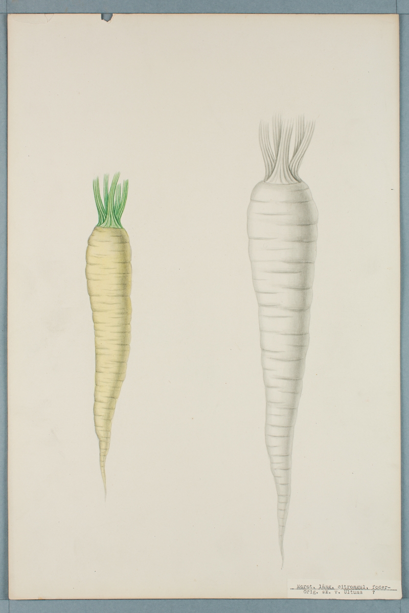 Sveriges kulturväxter. Illustration utförd av Henriette Sjöberg. Morot, fodermorot, lång, citrongul. Odlad Ultuna, utan datering. Inv. nr. C101 : 293.