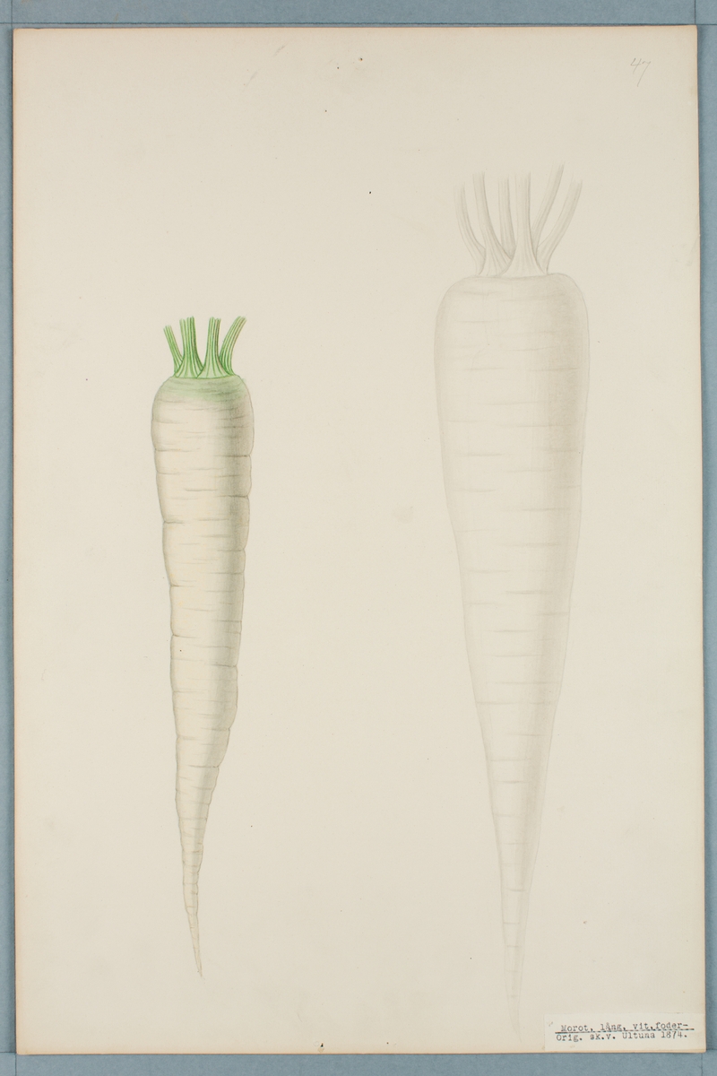 Sveriges kulturväxter. Illustration utförd av Henriette Sjöberg. Morot, fodermorot, lång, vit. Odlad Ultuna 1874. Inv. nr. C101 : 296.