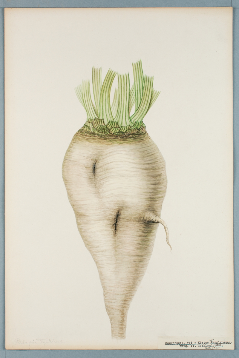 Sveriges kulturväxter. Illustration utförd av Henriette Sjöberg. Sockerbeta, vit, Klein-Wanzleben (påskrift Kleine Wanglebener fr. Tyskland). Odlad Experimentalfältet 1882. Inv. nr. C101 : 254. Signerad 1883.