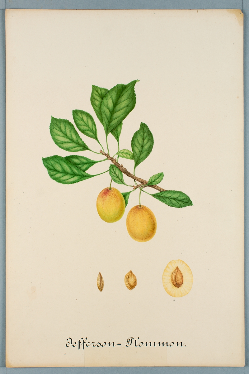 Sveriges kulturväxter. Illustration utförd av Henriette Sjöberg. Plommon, gula, Jefferson. Oklar odlingsplats. Signerad 1883.
