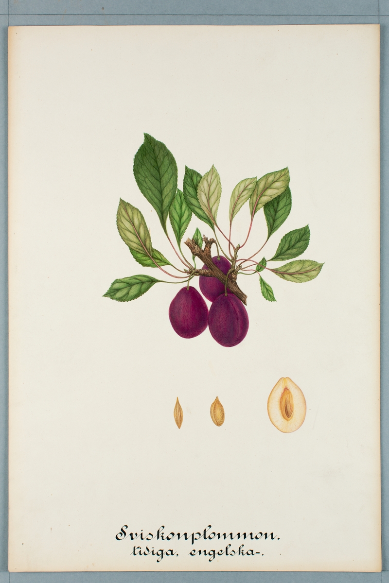 Sveriges kulturväxter. Illustration utförd av Henriette Sjöberg. Sviskon, tidiga engelska. Okänd odlingsort. Signerad 1883.