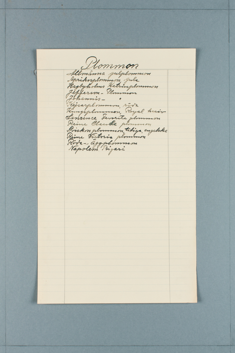 Sveriges kulturväxter. Lista med olika sorters plommon med koppling till illustrationer utförda av Henriette Sjöberg.