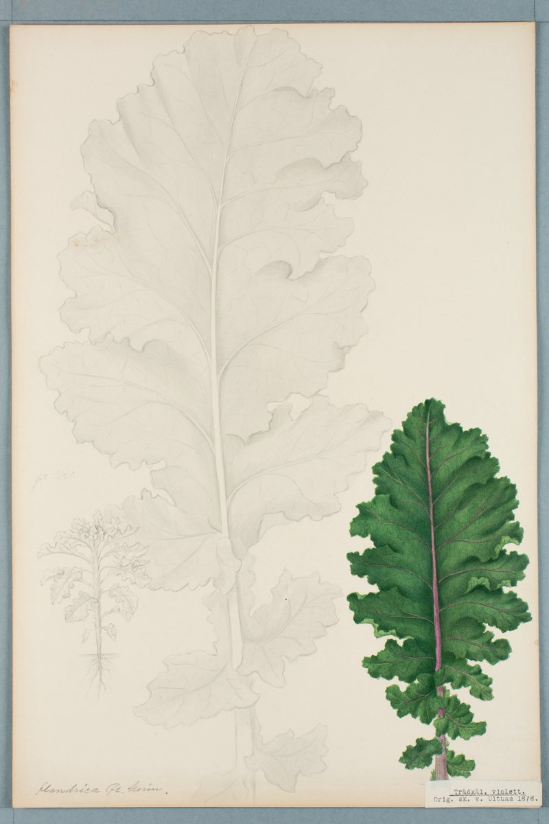 Sveriges kulturväxter. Illustration utförd av Henriette Sjöberg. Trädkål, violettnervig. Odlad Ultuna 1878. Inv. nr. C101 : 365.