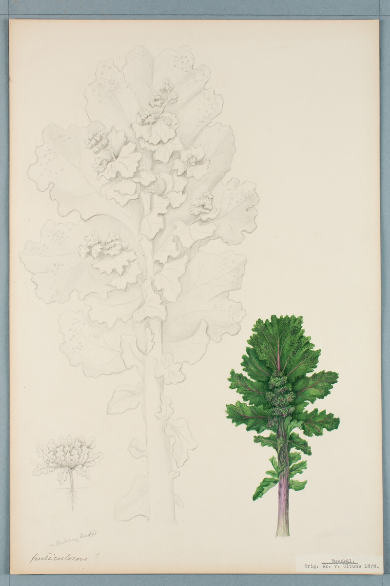 Sveriges kulturväxter. Illustration utförd av Henriette Sjöberg. Buskkål, rödnervig. Odlad Ultuna 1878. Inv. nr. C101 : 352b.