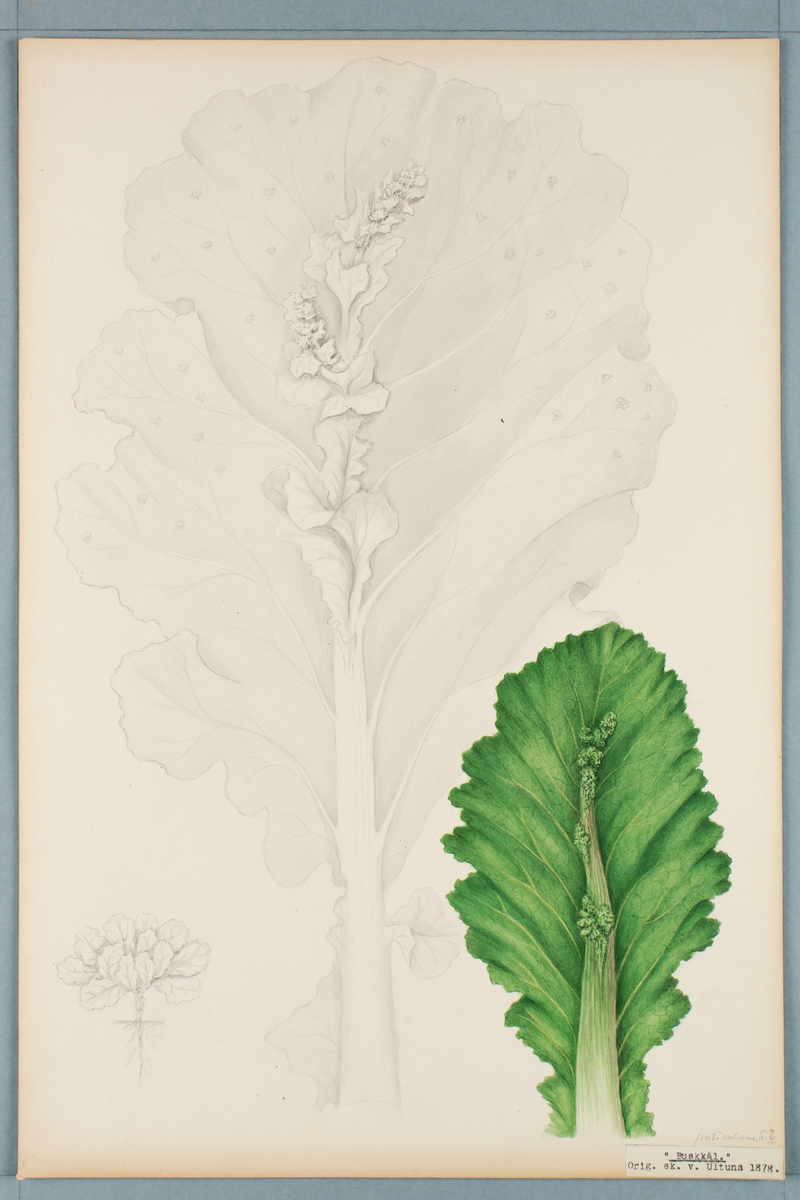 Sveriges kulturväxter. Illustration utförd av Henriette Sjöberg. Buskkål, ljusnervig. Odlad Ultuna 1878. Inv. nr. C101 : 352a.