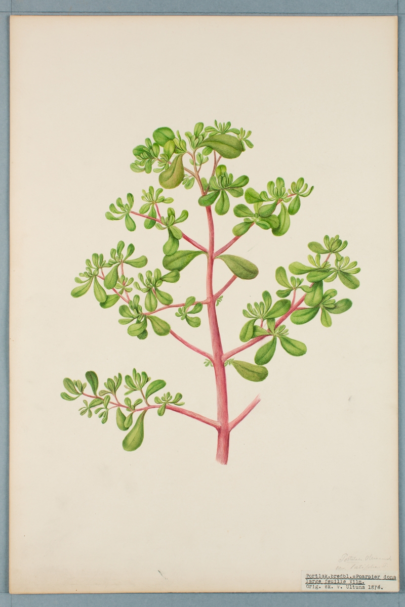 Sveriges kulturväxter. Illustration utförd av Henriette Sjöberg. Portlak, bredbladig, Poarpier dona´large feuil. Odlad Ultuna 1878. Inv. nr. C101 : 407.
