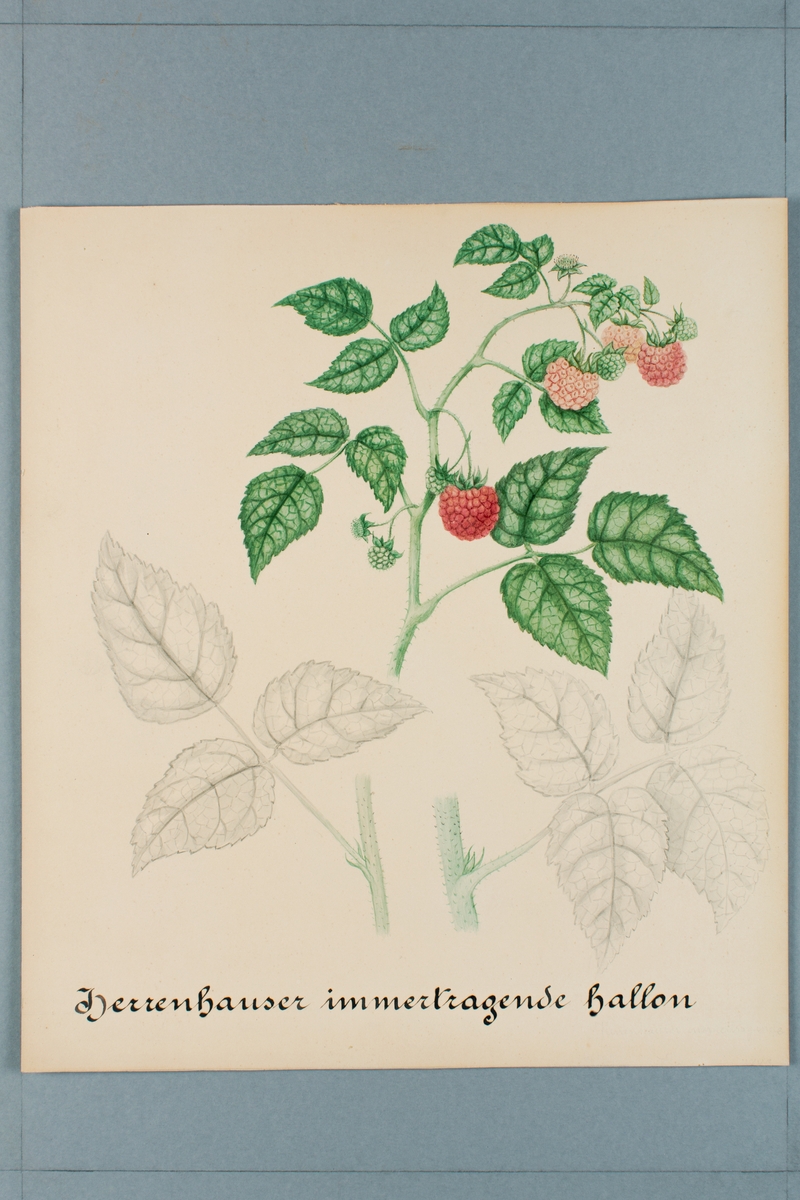 Sveriges kulturväxter. Illustration utförd av Henriette Sjöberg. Hallon, Herrenhauser immertragende. Odlingsplats och datering saknas. Nr. 33