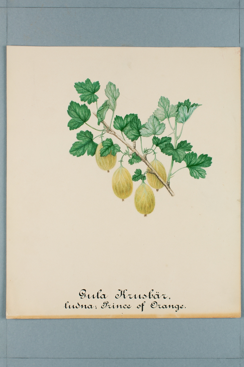 Sveriges kulturväxter. Illustration utförd av Henriette Sjöberg. Krusbär, gula, ludna, Prince of Orange. Odlingsplats och datering saknas.