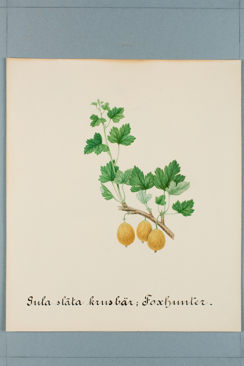 Sveriges kulturväxter. Illustration utförd av Henriette Sjöberg. Krusbär, gula, släta, Foxhunter. Odlingsplats och datering saknas. Nr. 10.