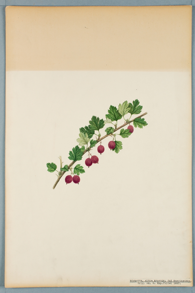 Sveriges kulturväxter. Illustration utförd av Henriette Sjöberg. Krusbär, mörkröda, släta, Små amerikanska. Odlade Experimentalfältet 1882. Nr. 15. Signerad 1883.