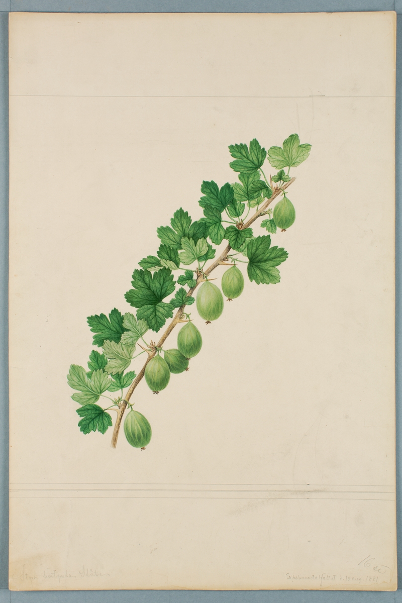 Sveriges kulturväxter. Illustration utförd av Henriette Sjöberg. Krusbär, Stora hvitgula släta. Odlade Experimentalfältet 1881. Signerad 1881.