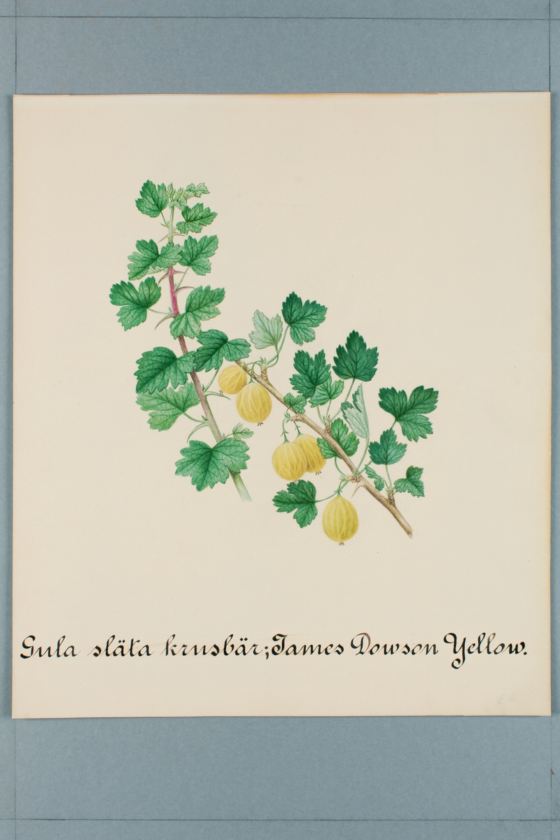 Sveriges kulturväxter. Illustration utförd av Henriette Sjöberg. Krusbär, gula, släta, James Dowson Yellow. Odlingsplats och datering saknas. Nr. 12.