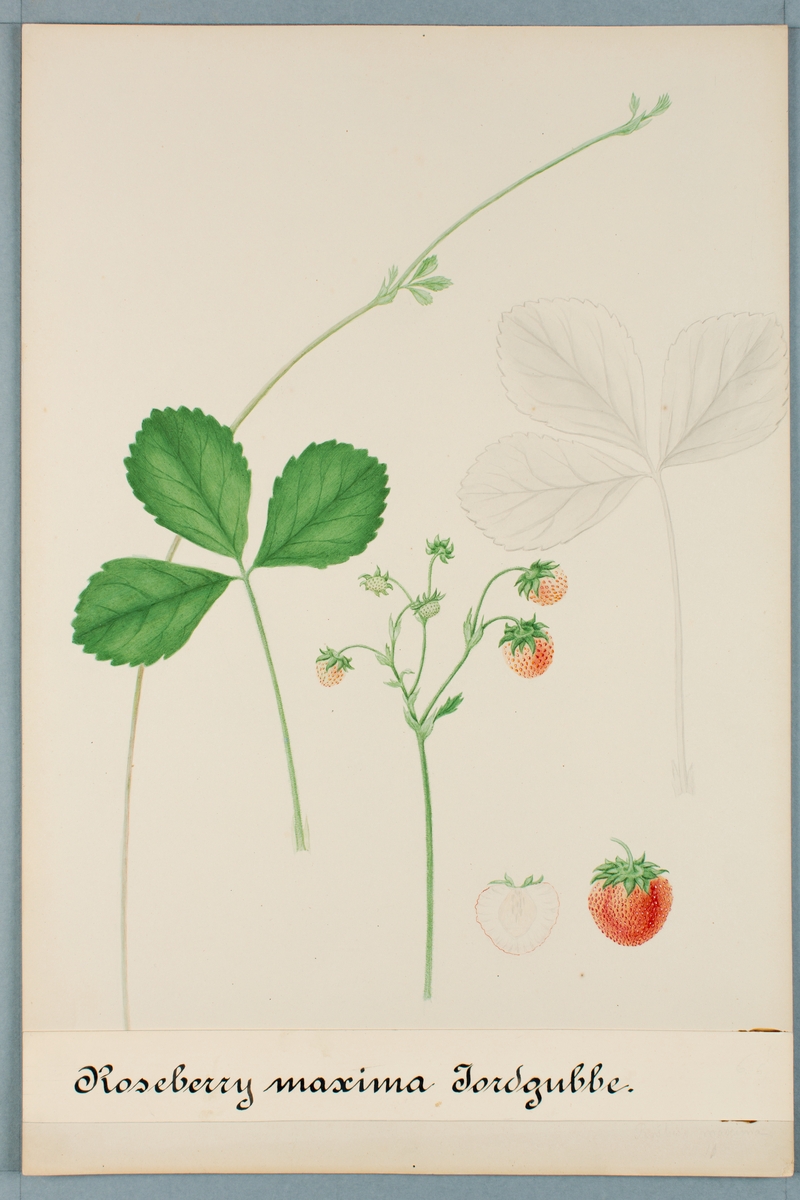 Sveriges kulturväxter. Illustration utförd av Henriette Sjöberg. Jordgubbe, Roseberry Maxima. Odlingsplats och datering saknas. Nr. 60. Signerad H.S.