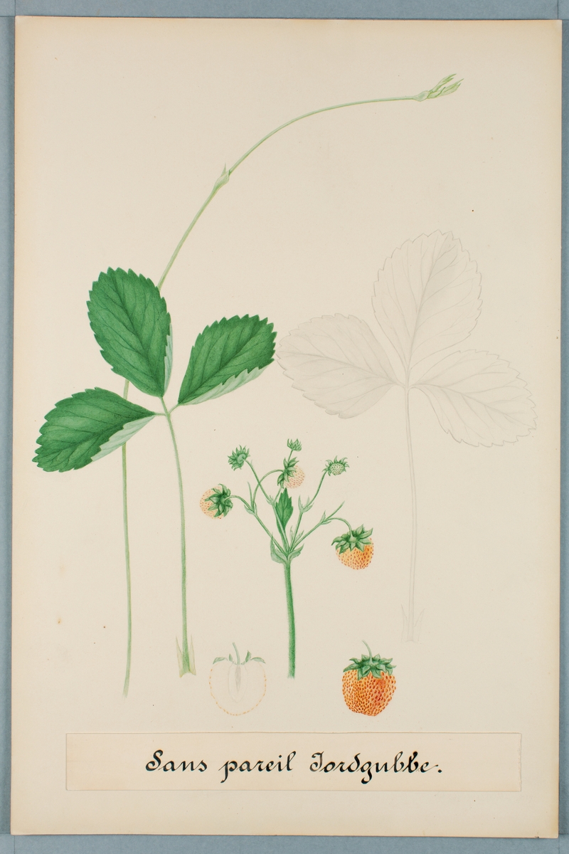 Sveriges kulturväxter. Illustration utförd av Henriette Sjöberg. Jordgubbe, Sans pareil. Odlingsplats och datering saknas. Nr. 62. Signerad H.S.