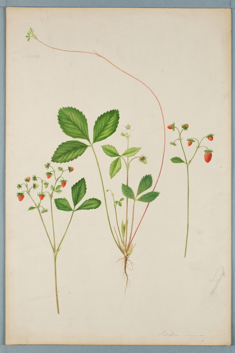 Sveriges kulturväxter. Illustration utförd av Henriette Sjöberg. Smultron, röda revor. Odlingsplats och datering saknas. Signerad H.S.