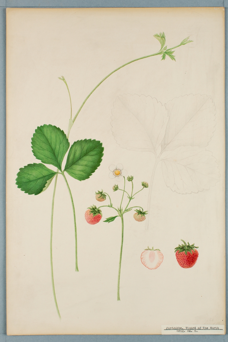 Sveriges kulturväxter. Illustration utförd av Henriette Sjöberg. Jordgubbe, Vizord of the North. Odlingsplats och datering saknas. Nr. 67. Signerad H.S.