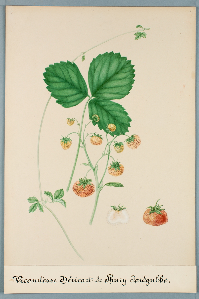 Sveriges kulturväxter. Illustration utförd av Henriette Sjöberg. Jordgubbe, Héricart de Thury (påskrift Vicomtesse Héricart de Thury). Odlad Experimentalfältet 1883. Nr. 49. Signerad H.S. 1883. Jämför NMA.0098084.