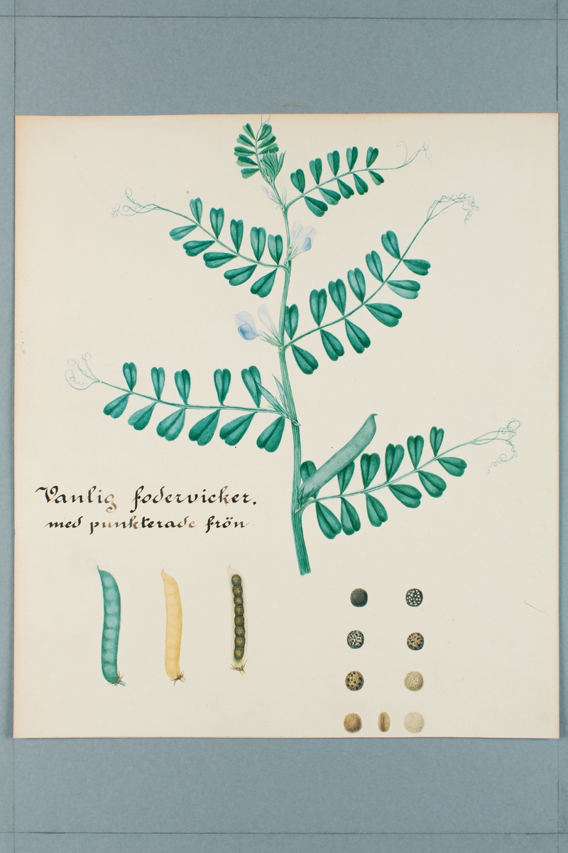 Sveriges kulturväxter. Illustration utförd av Henriette Sjöberg. Vanlig fodervicker med punkterade frön. Odlingsplats och datering saknas.