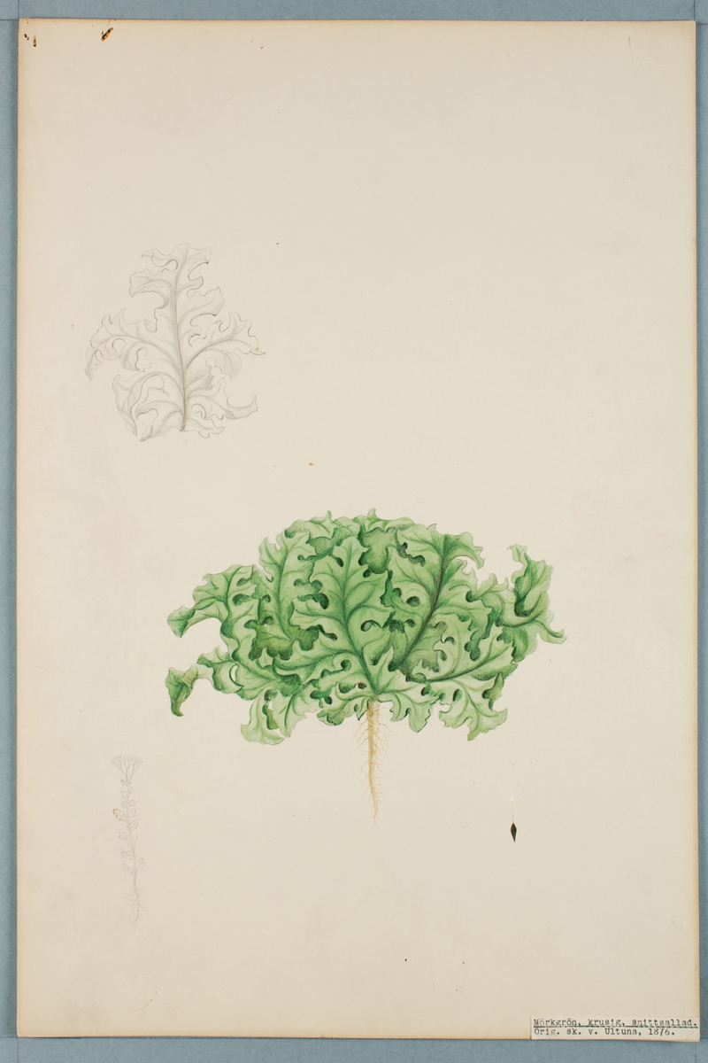 Sveriges kulturväxter. Illustration utförd av Henriette Sjöberg. Snittsallad, mörkgrön, krusig. Odlad Ultuna 1878 (i bildtext står 1876). Inv. nr. C101 : 417.