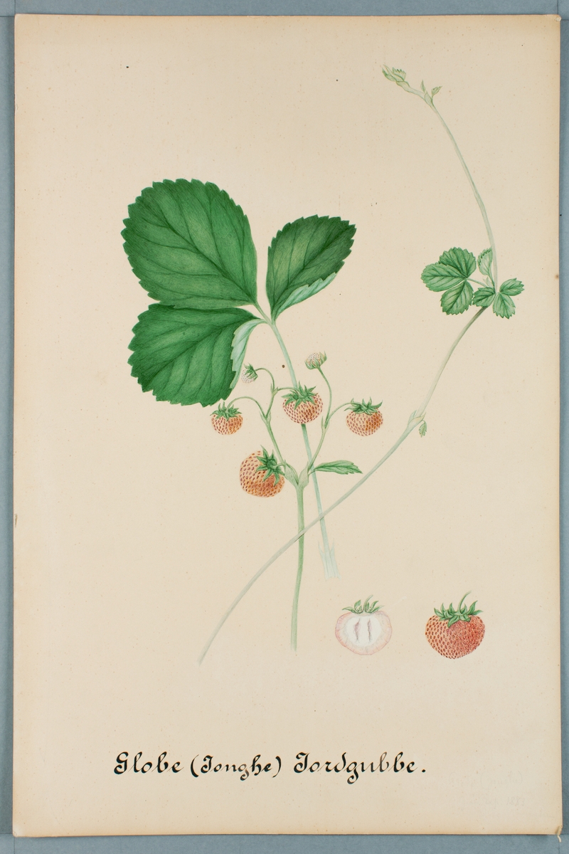 Sveriges kulturväxter. Illustration utförd av Henriette Sjöberg. Jordgubbe, Globe (Jonghe). Odlingsplats saknas 1883. Nr. 46. Signerad 1883.